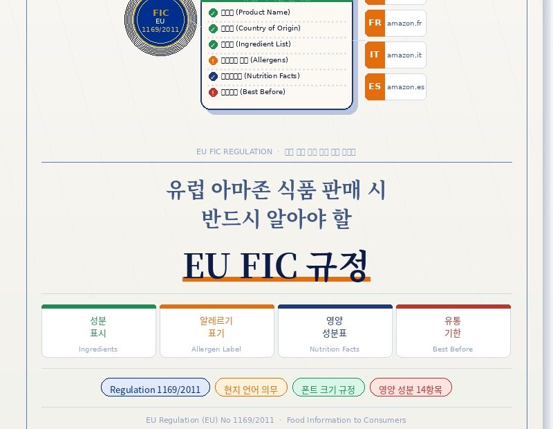 유럽 시장에서 식품을 판매하려는 판매자라면 반드시 이해해야 하는 규정 중 하나가 바로 EU FIC 규정입니다. EU FIC는 “Food Information to Consumers”의 약자로, 소비자에게 제공되는 식품 정보를 규정한 유럽연합의 법률입니다. 해당 규정은 소비자가 식품을 구매할 때 충분하고 정확한 정보를 바탕으로 선택할… 유럽 아마존 식품 판매 시 반드시 알아야 할 EU FIC 규정